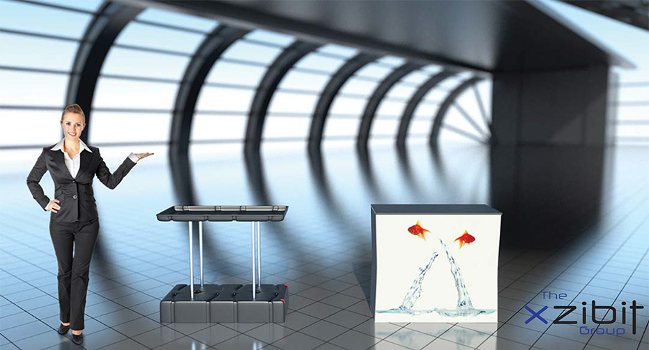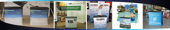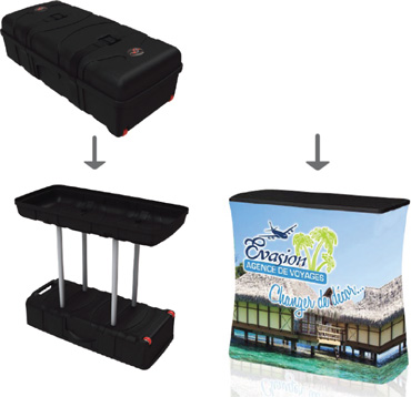 The Horizon Counter is a hard shell shipping case that converts into a counter. The wheeled plastic case contains the top and bottom frame of the counter, the separator posts & counter top insert. The case is designed to fit a variety of displays & accessories. The counter graphic is a fabric sock with a zipper in the back to allow for access into the internal storage area while setup. The counter also has a top storage area.